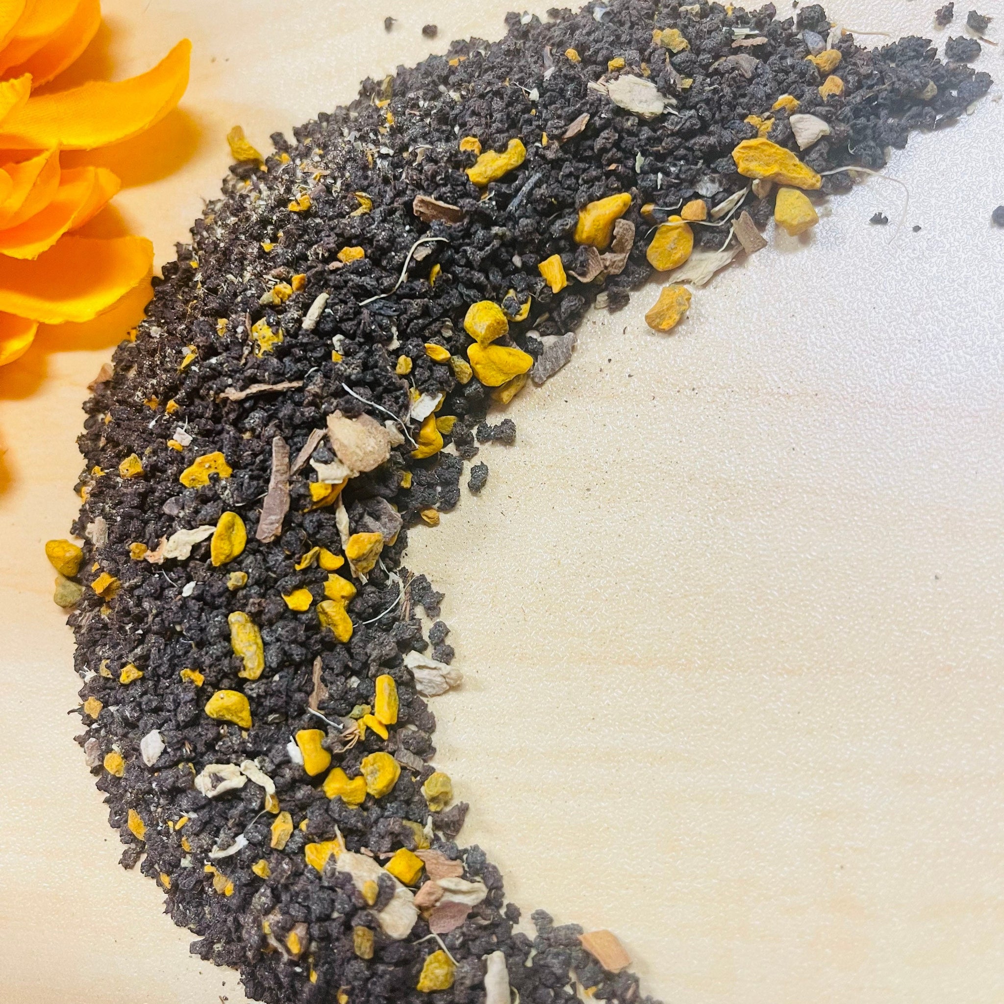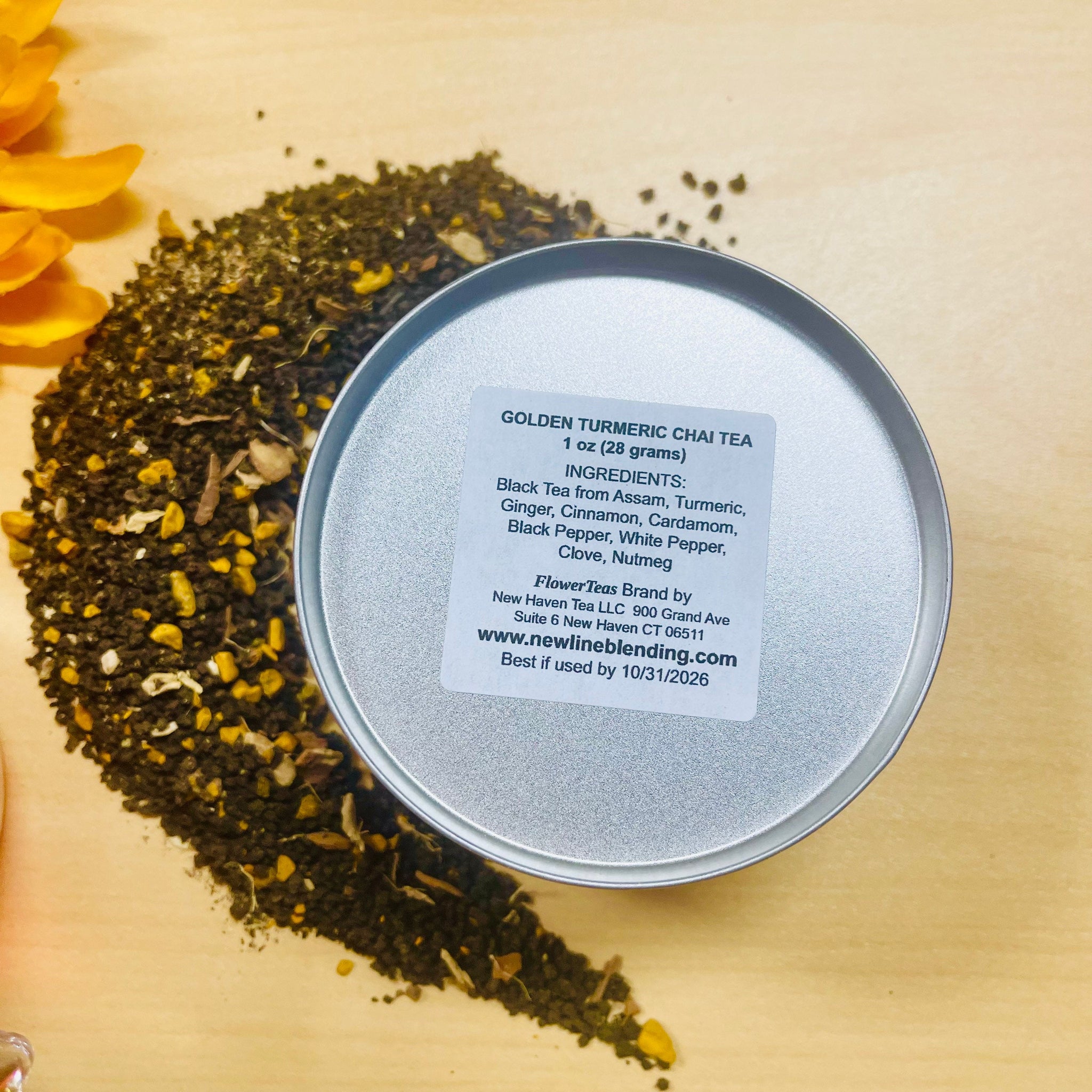 Golden Turmeric Chai Black Loose Leaf Tea Caffeine? Yes, it grows out of the ground that way! Non GMO Fair Trade Compliant Sustainably Sourced Gluten Free 1 oz of loose leaf can brew approximately 15 cups depending on the strength desired. PREPARATION: Place 1 heaping teaspoon of loose leaf tea per 6 oz of hot to boiling water into an infuser or filter. Allow tea to steep for 5 minutes, remove infuser/filter with leaves and enjoy. If you need disposable tea filters find them in our accessories section.