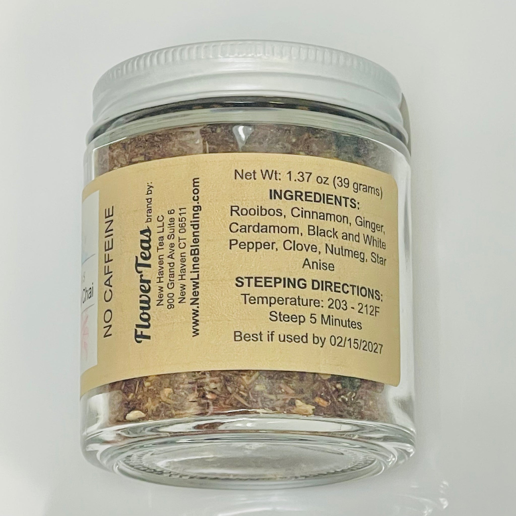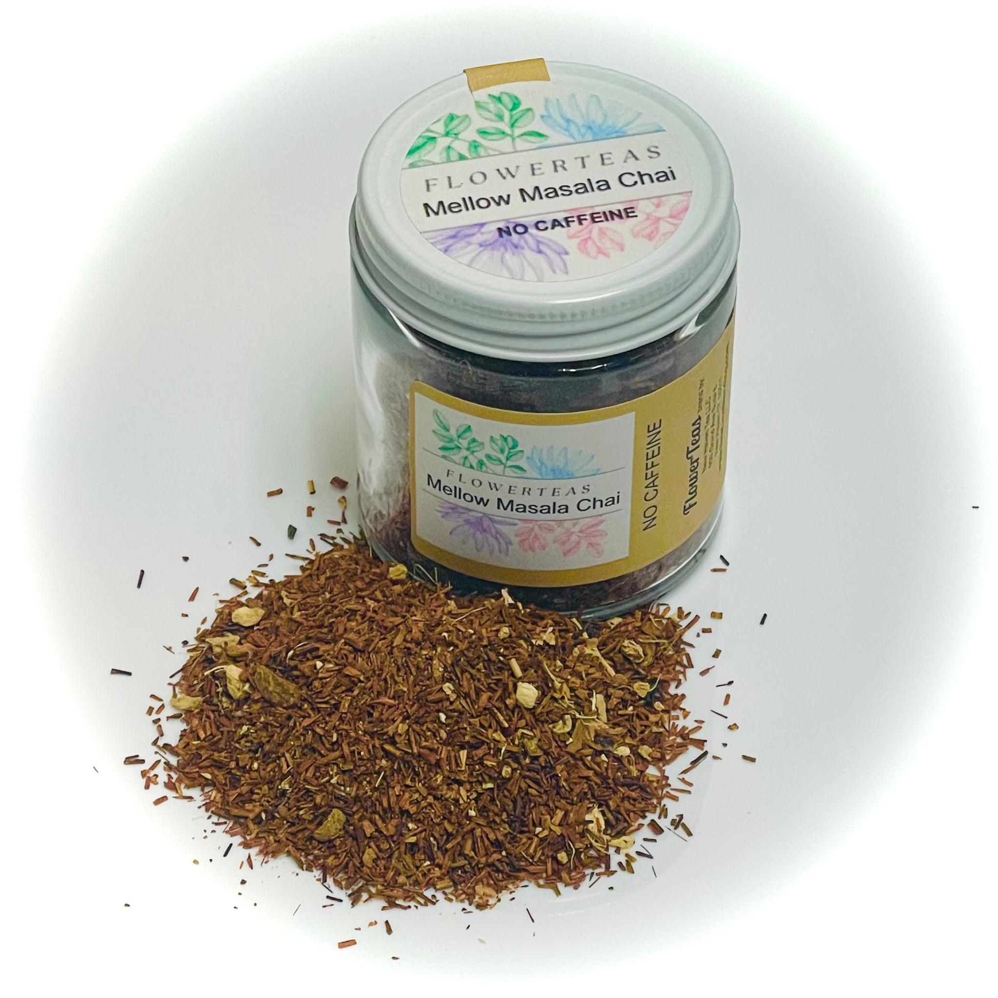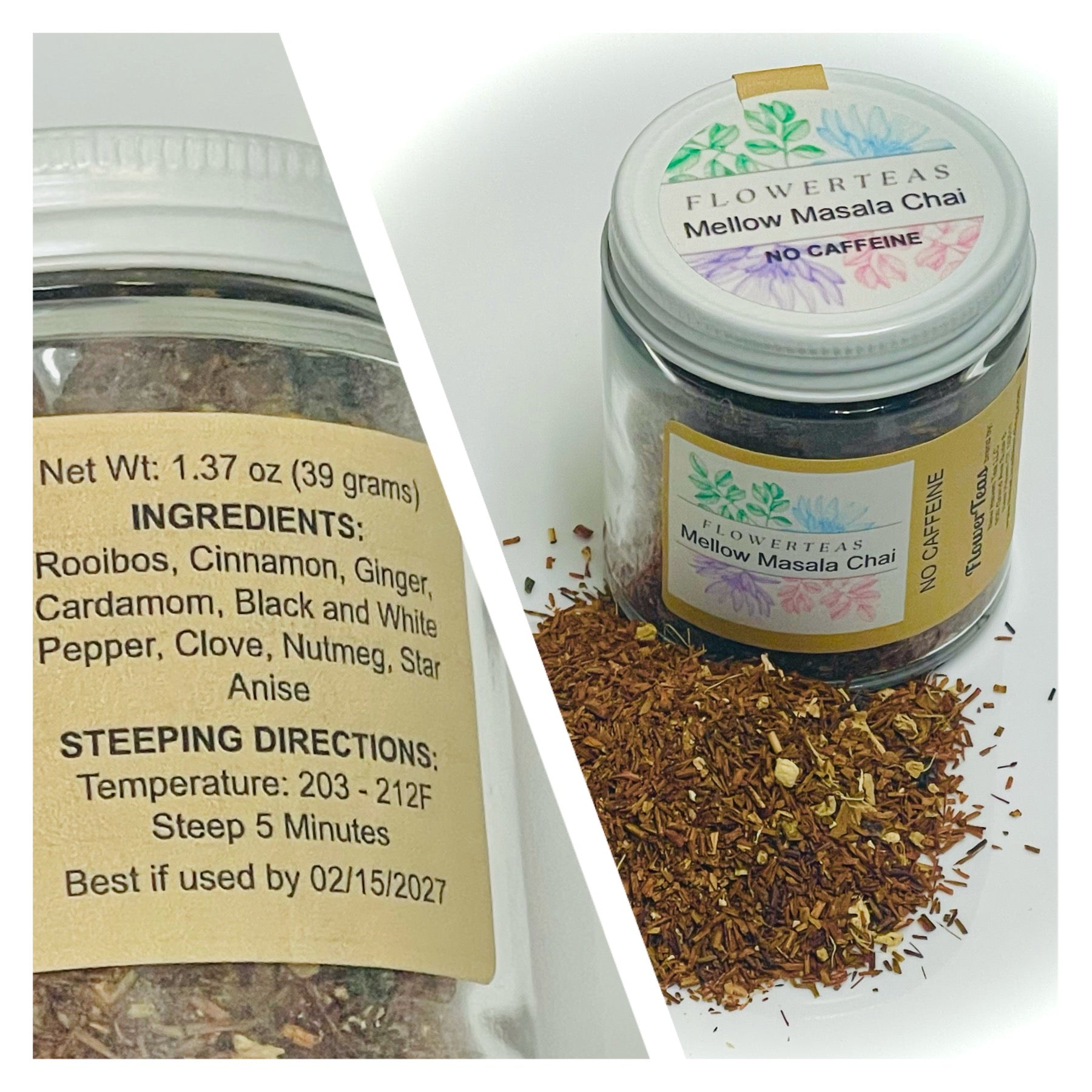 Mellow Masala Chai Herbal Loose Leaf Tea  Masala chai is traditionally made with a black tea base, here we've blended rooibos leaves with the aromatic spices you know and love. Try mixing it with the steamed milk of your choice to make a delicious decaf chai latte.    Ingredients - African Rooibos Leaf, cinnamon, cardamom, nutmeg, ginger root, white and back pepper, anise Caffeine - None Non GMO Sustainably Sourced Fair Trade Compliant Gluten Free PREPARATION: Place 1 heaping teaspoon of loose leaf tea per 6 oz of hot to boiling water into an infuser or filter. Allow tea to steep for 3 to 5 minutes, remove infuser/filter with leaves and enjoy!