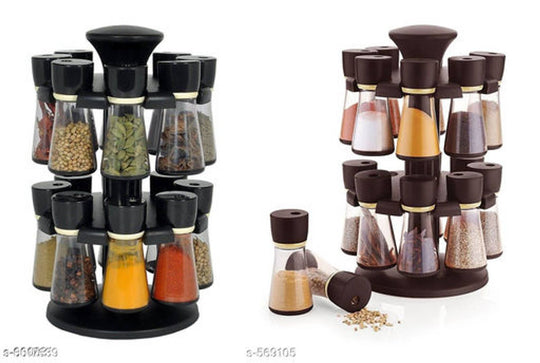 spice rack container set ideal storage solution for spice and herbs unbreakable body easy to clean transparent container for easy access and pick of containers revolving stand for east access and pick of containers shake and pore with multiple hole selection sleek and elegant look add flavor to your kitchen decor simple durable and comfortable to use storage container.