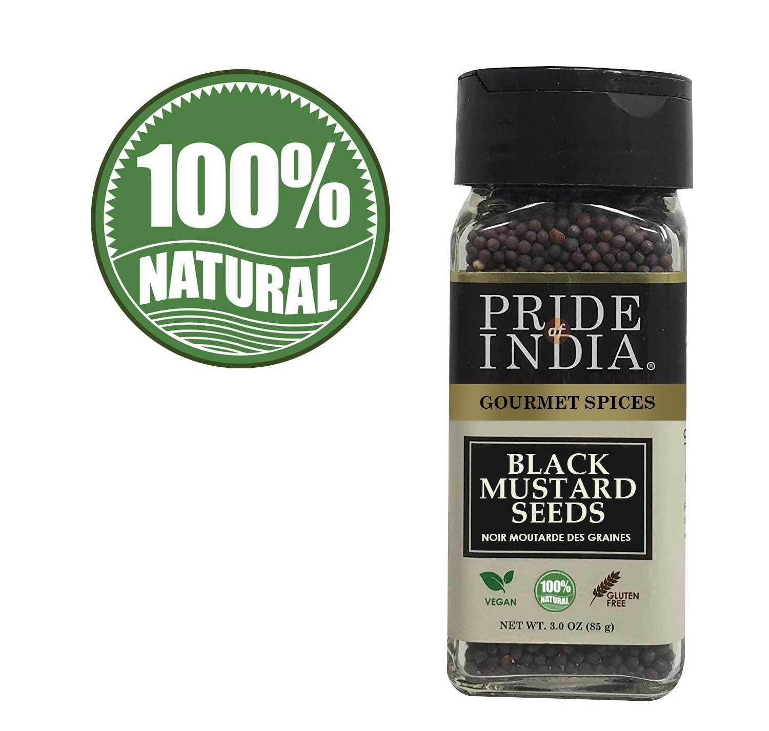 Pride of India – Black Mustard Seed – Gourmet & Vegan Indian Spice – Pungent/Spicy Flavor – Dry Seasoning - Gluten & GMO Free – Easy to Use – 3oz. Small Dual Sifter Bottle