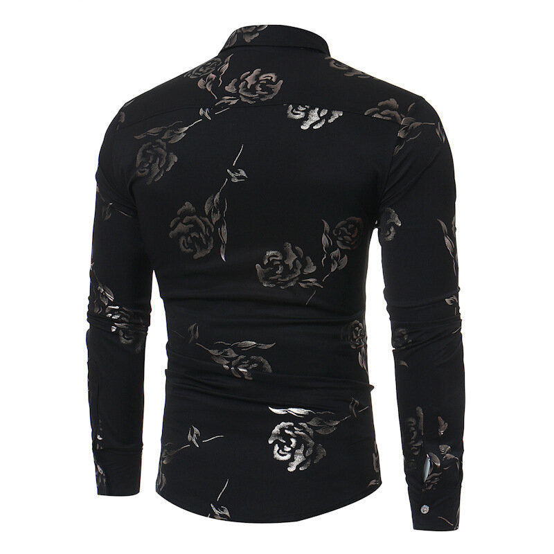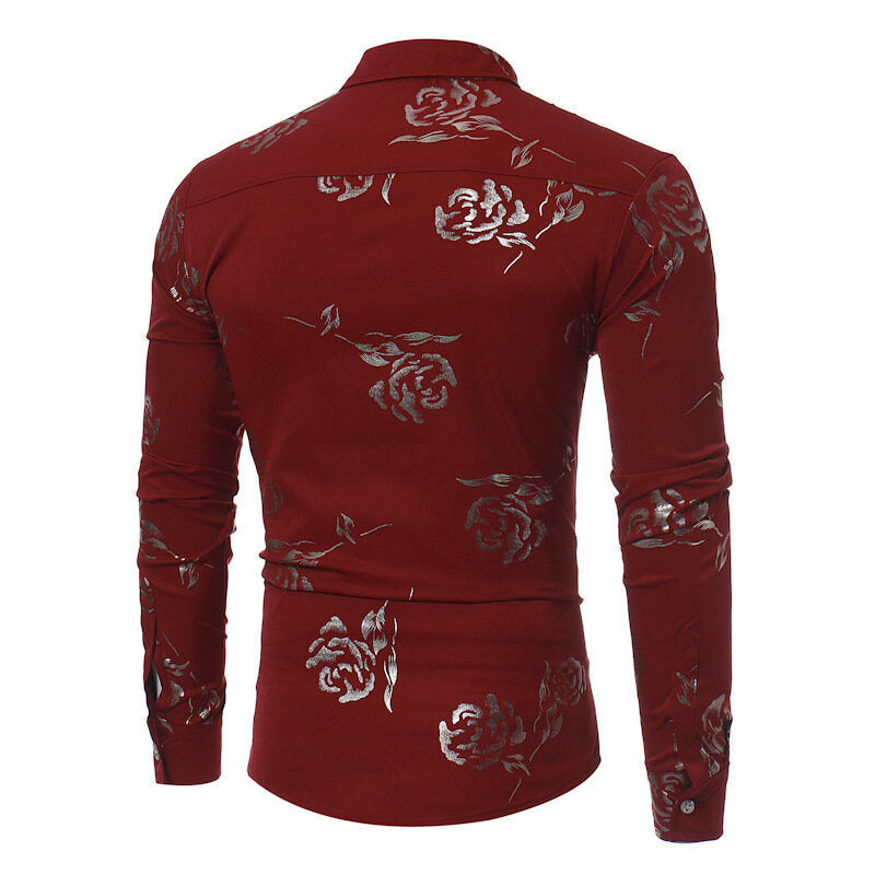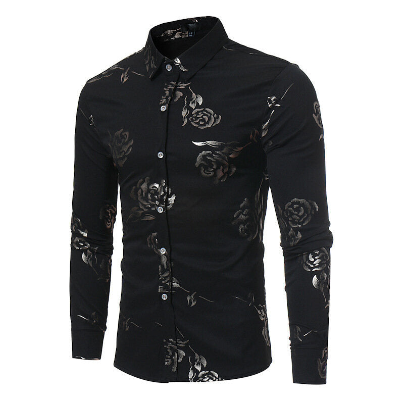 Mens Casual Shirts Gold Rose Printed Slim Fit Long Sleeve Dress Shirts/Prom Performing Shirts