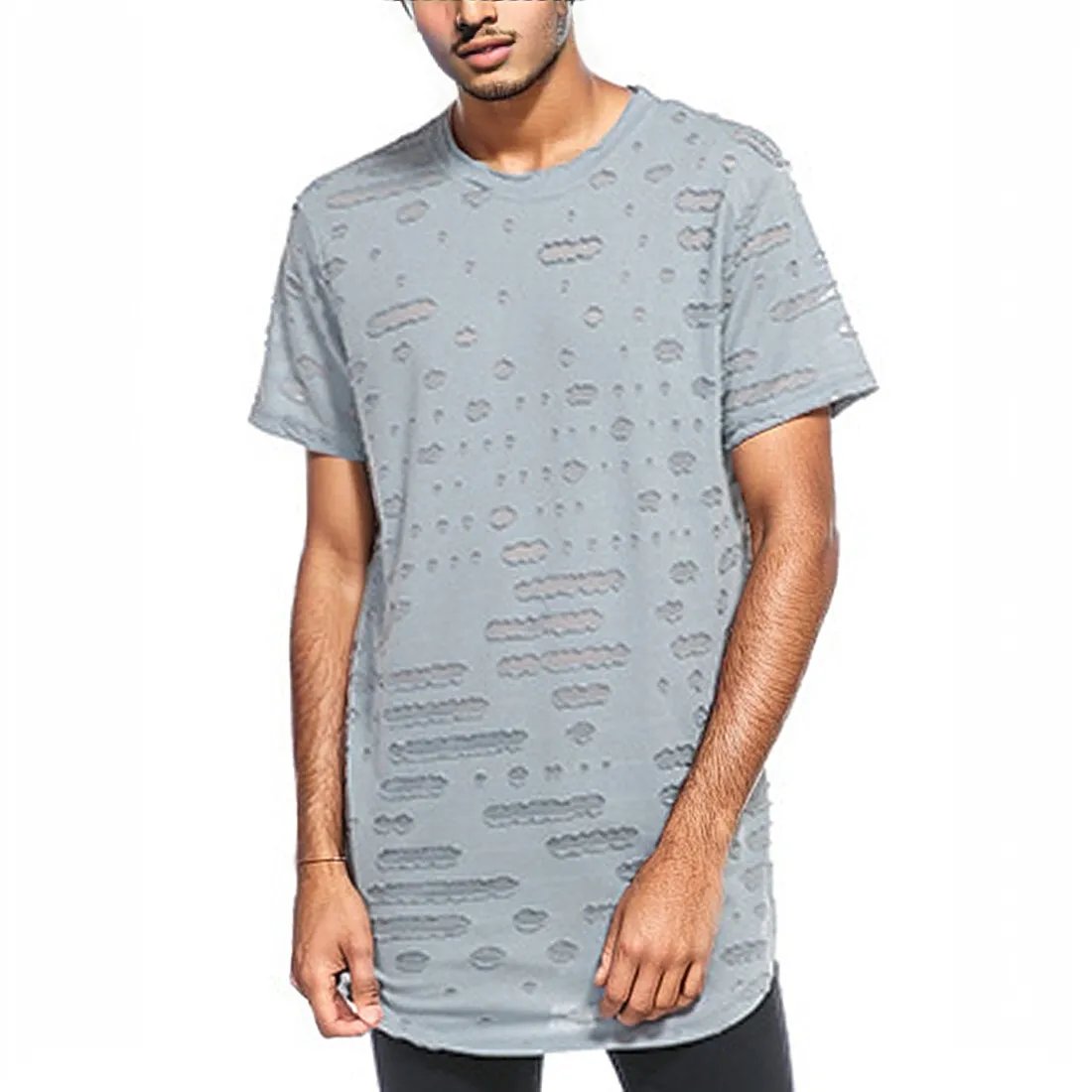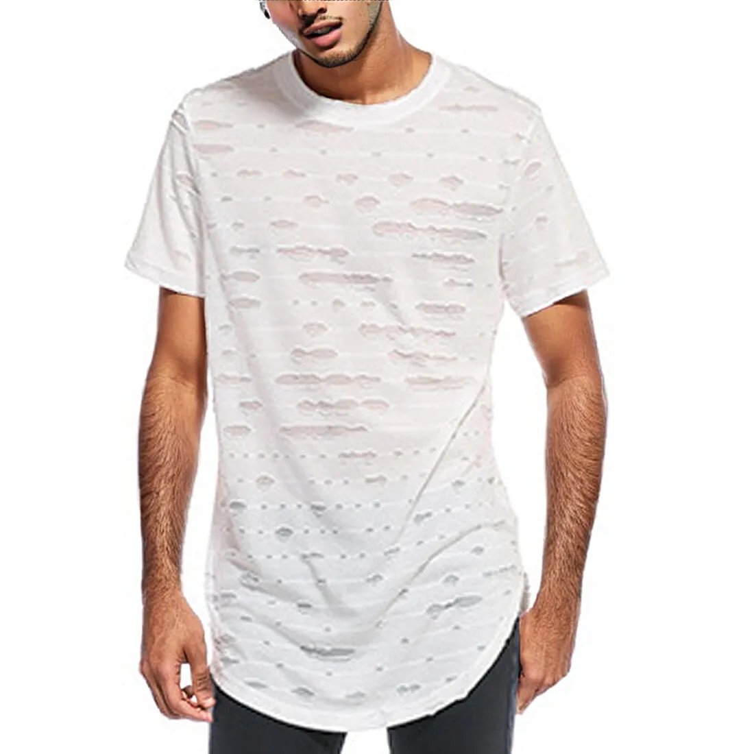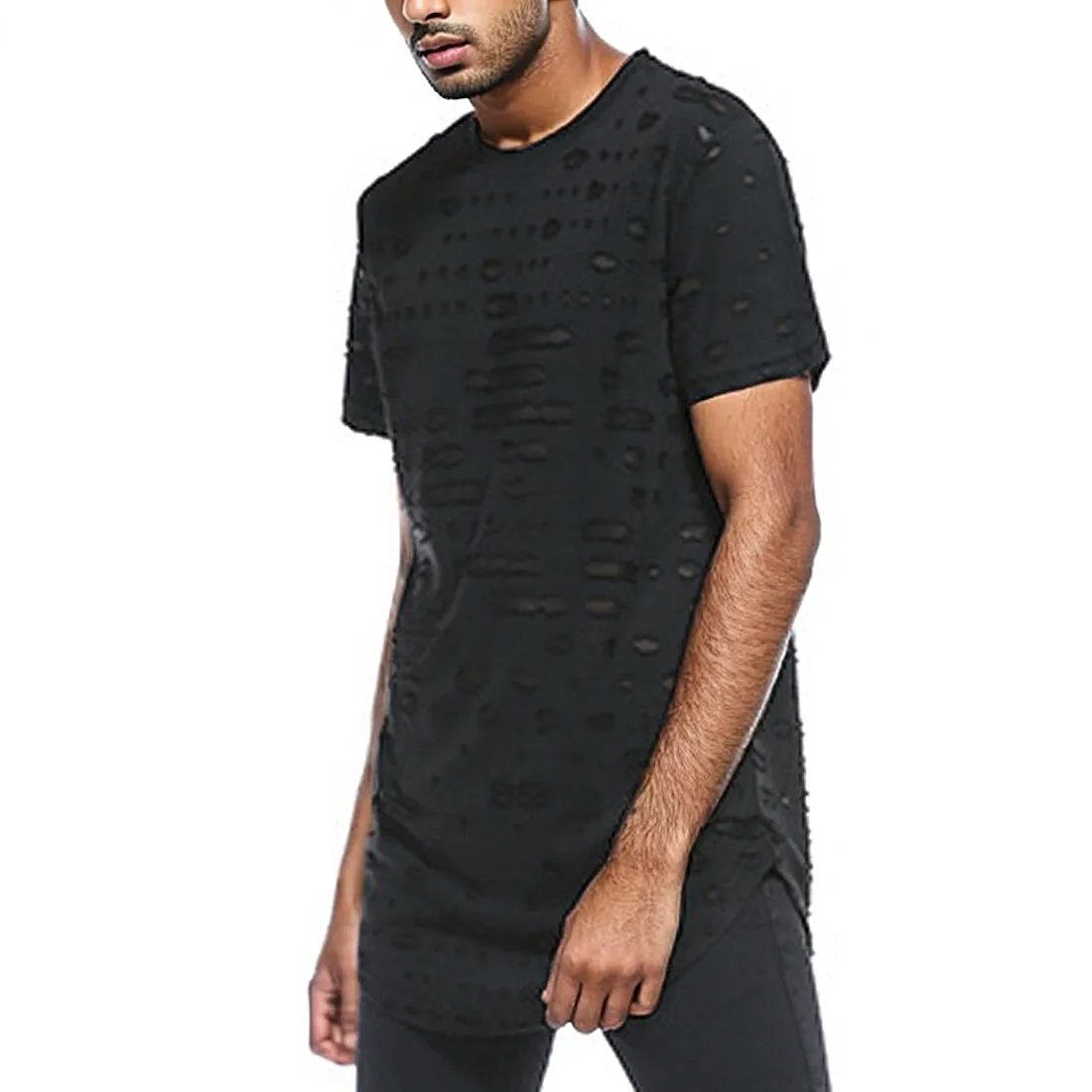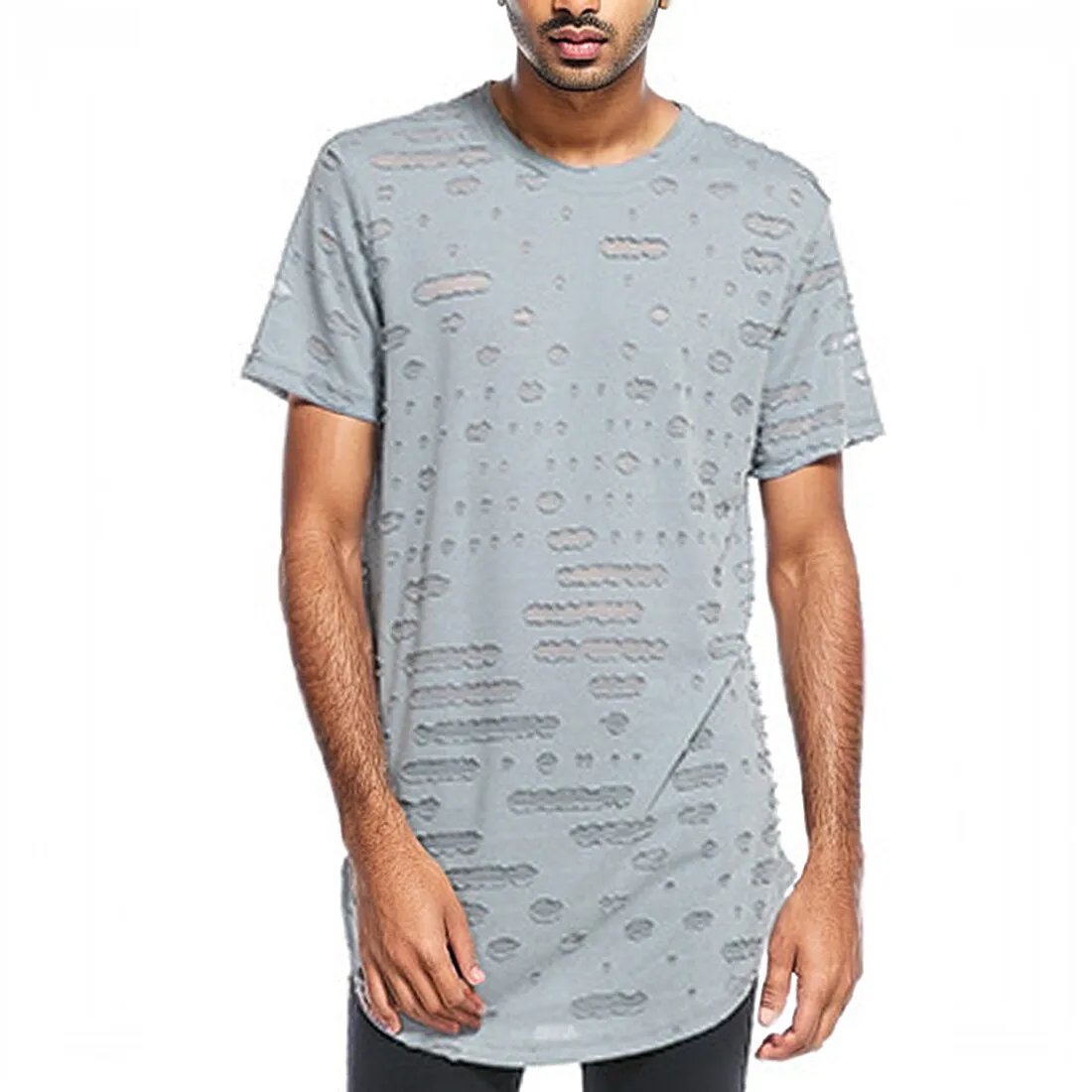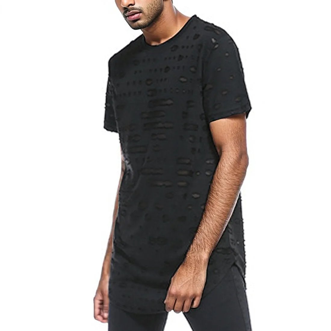 Mens Hipster Hip Hop Long Drop Tail T Shirts Hemline Hole Crewneck Tees