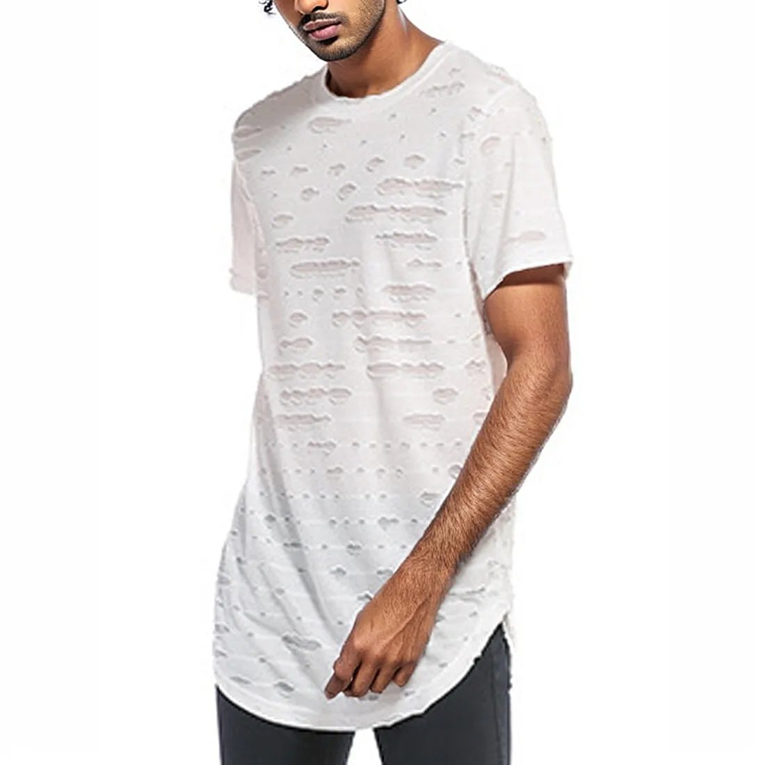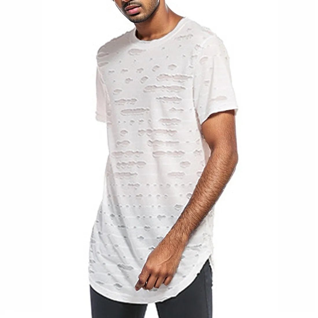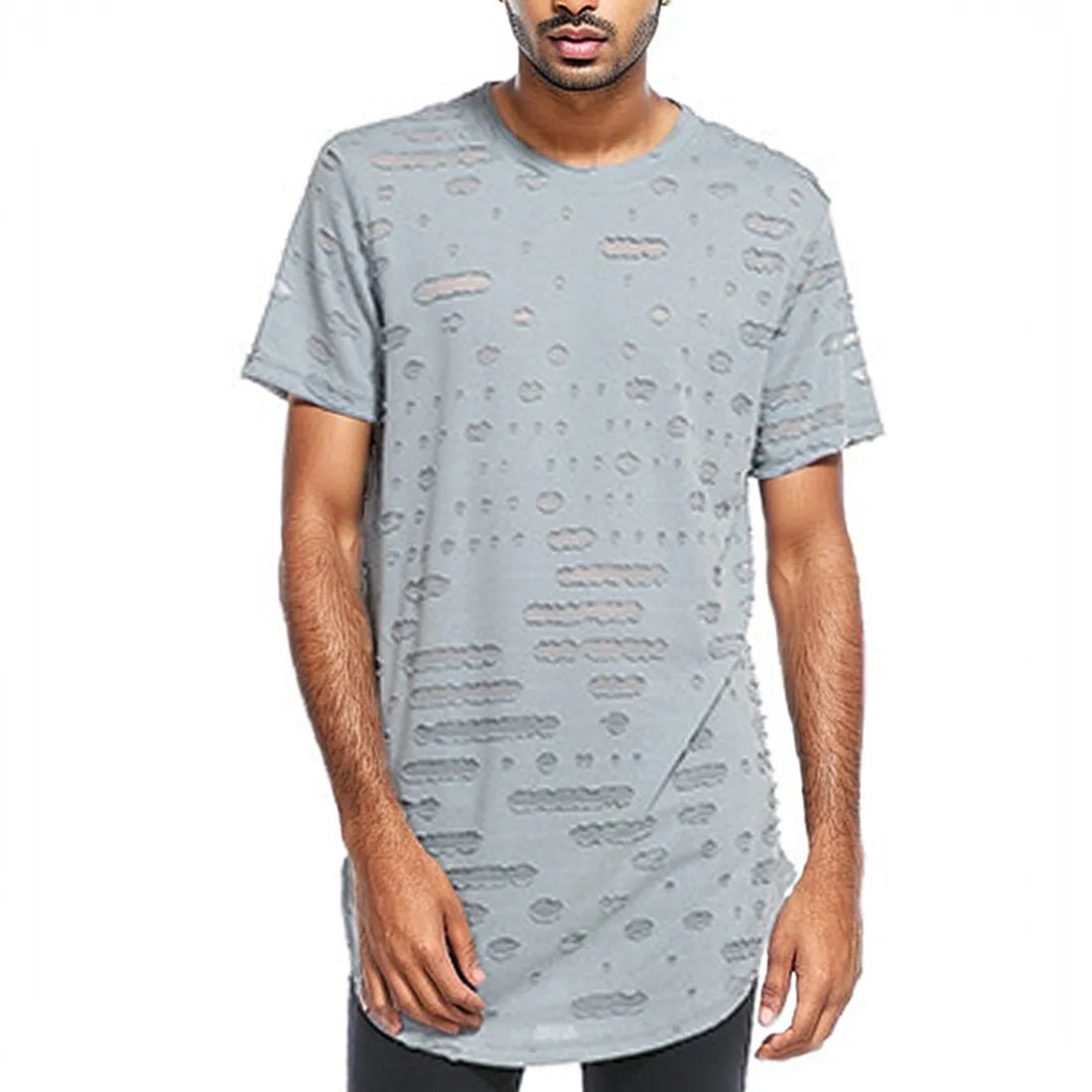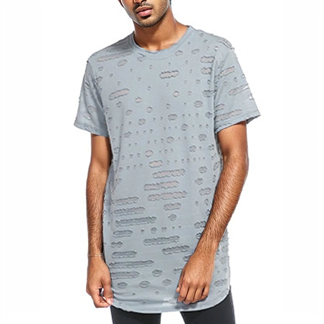 Mens Hipster Hip Hop Long Drop Tail T Shirts Hemline Hole Crewneck Tees