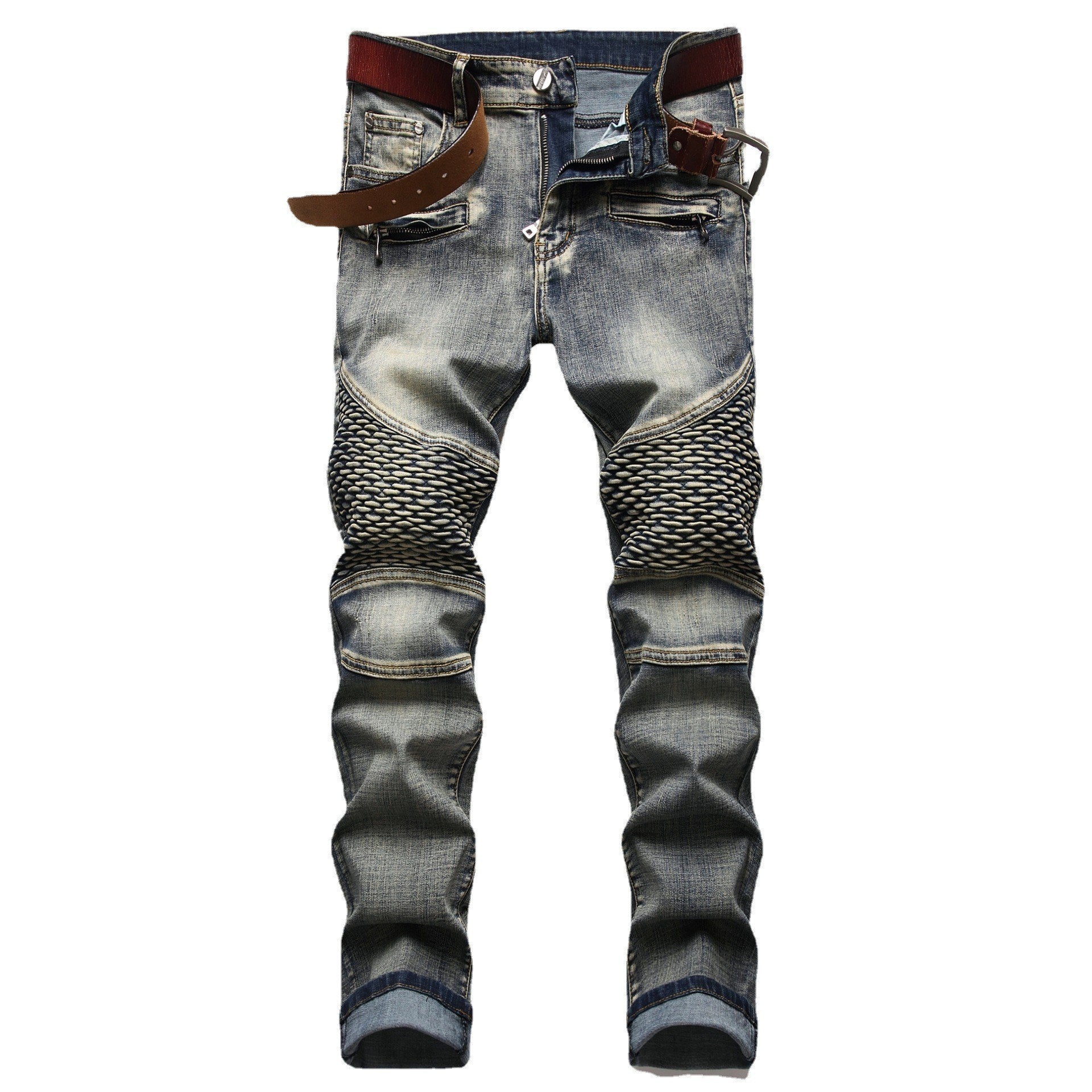 Washed biker jeans with ribbing and special sewing pattern on leg and waist