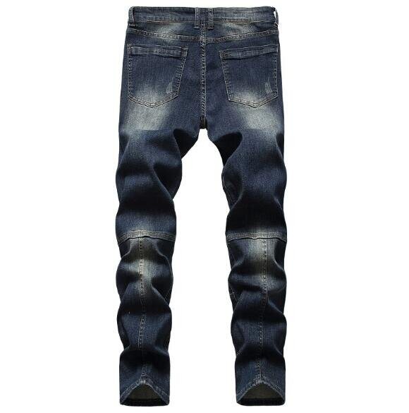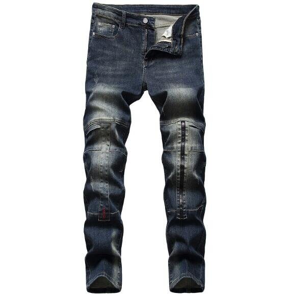 - Washed biker jeans with ribbing and special sewing pattern on leg and waist