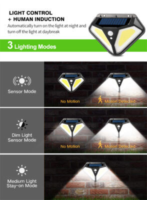 Material: PC+ABSLight Source: 50COB can reach 1000LM3 Lighting Modes: Motion Sensing Only; Dim-light + Motion Sensing; Full Light Static-OnDetecting mode: Light & Motion SensingSolar panel: Monocrystalline silicon 5.5V 1.43WBattery:7V 1800mAh 18650-lithium with charge and discharge protectionOutput power: 2V/7WCharging time: 6 hours in the sunPIR sensing angle: 120 degreesSensing distance: 8-10 metersProduct size: 4'x5.5'Waterproof: IP65