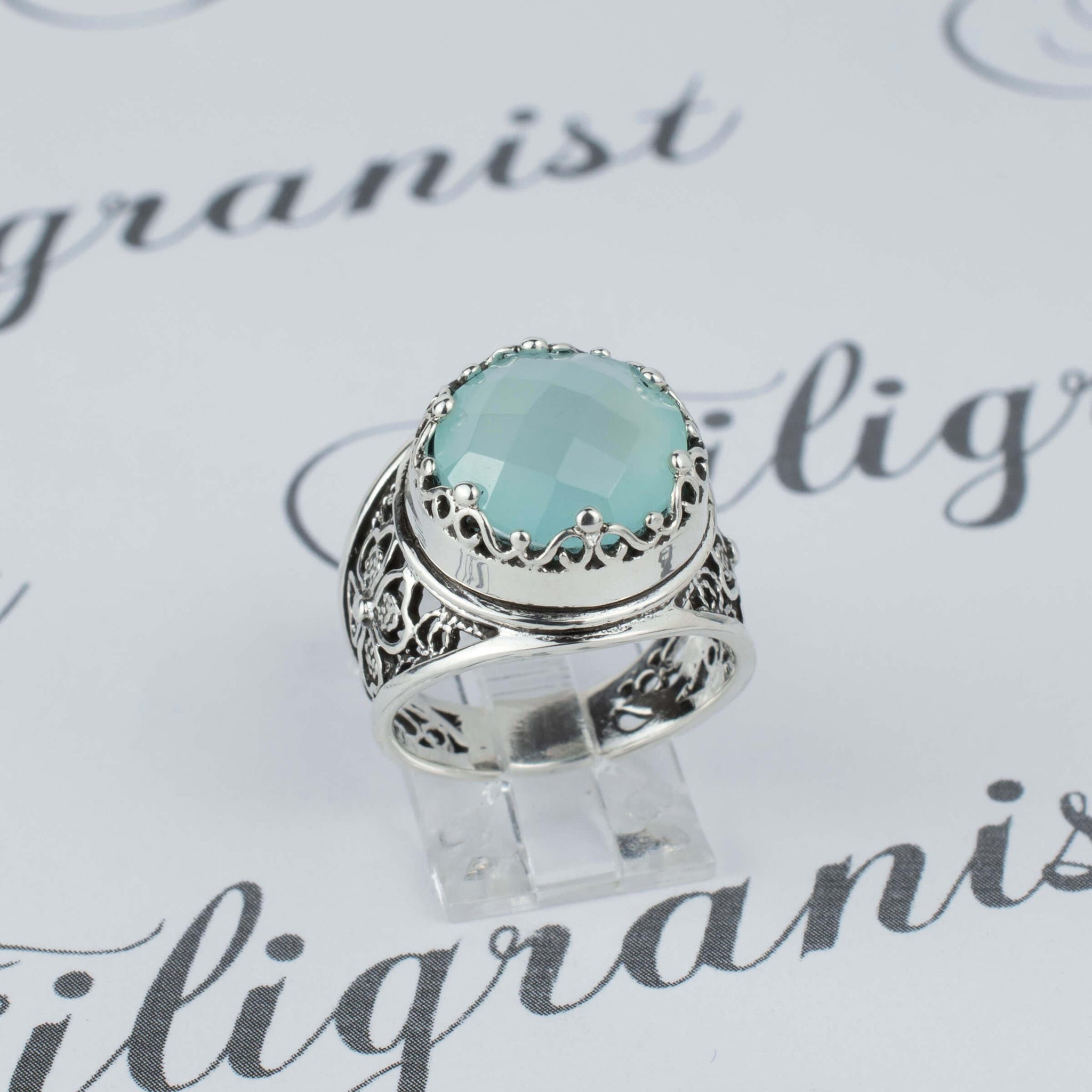 Sterling Silver Filigree Art Aqua Chalcedony Gemstone Crown Statement Ring