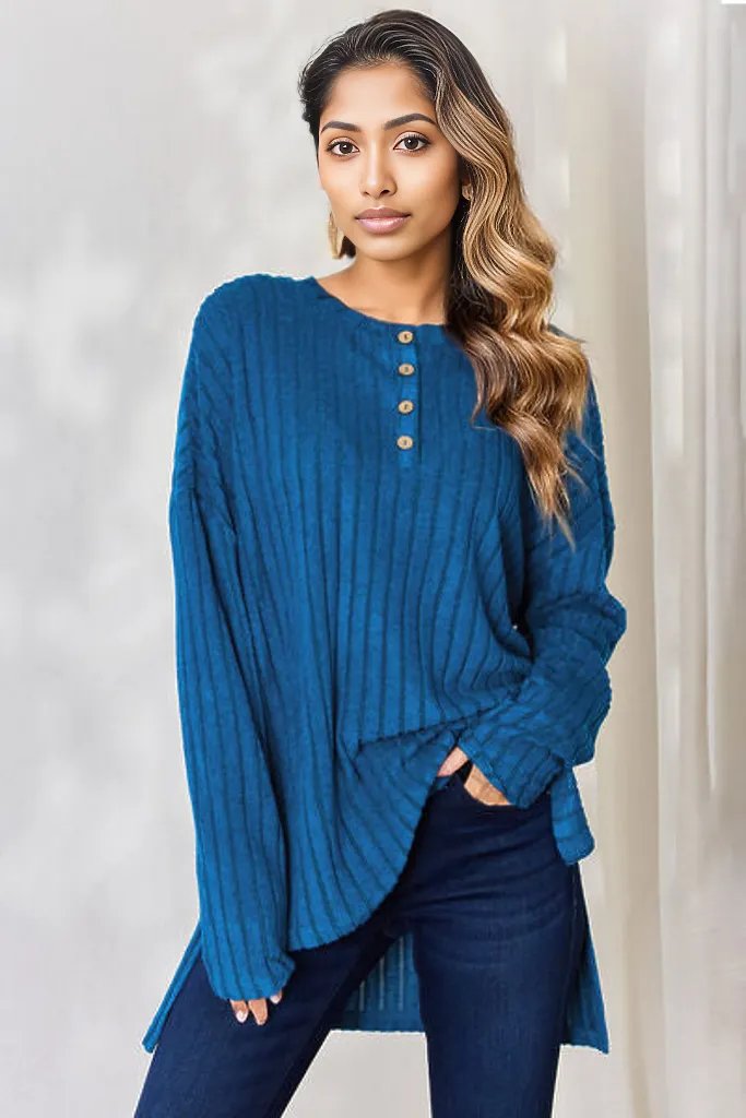 Basic Bae Full Size Ribbed Half Button Long Sleeve High-Low T-Shirt