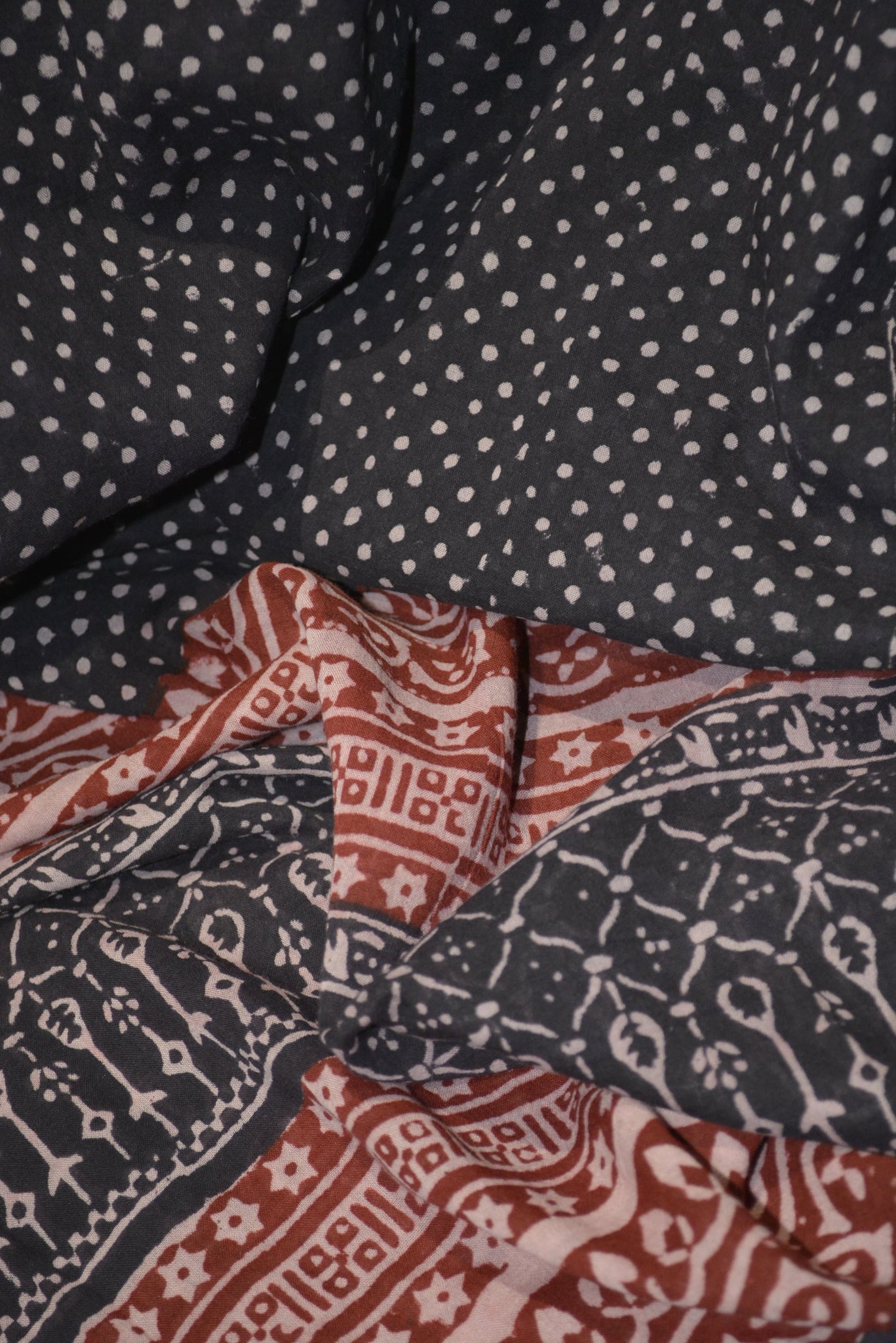 Hand Block printing is a century-old Indian art form and a hand skill practice that involves a lot of hard work and the production process is painstaking and manual utilizing natural dyes and vegetable pastes. In the making of this printed fabric, a hand-carved teak wood block is dipped in plant extracted dyes in black and red and stamped by hand onto the soft cotton fabric. Crafted with natural dyes and hand-printed using stained wood blocks makes it a piece of art.