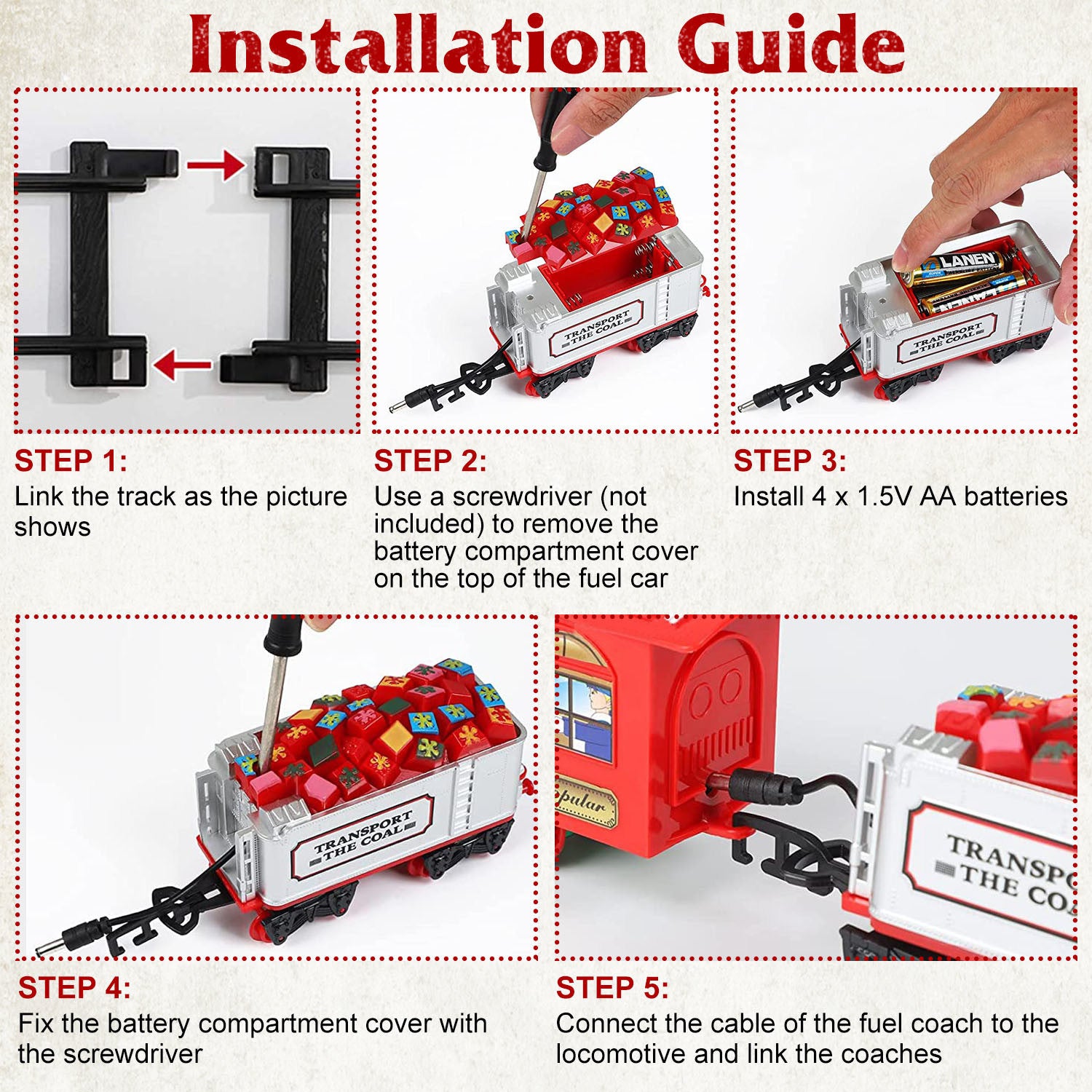 *Christmas Train Set*:This Christmas train set contains 4 coaches; including 1 engine; 1 fuel coach; 1 passenger coach; and 1 Santa Claus coach. Total train size:23in. Perfect to run beneath the Christmas tree as an annual holiday train display.