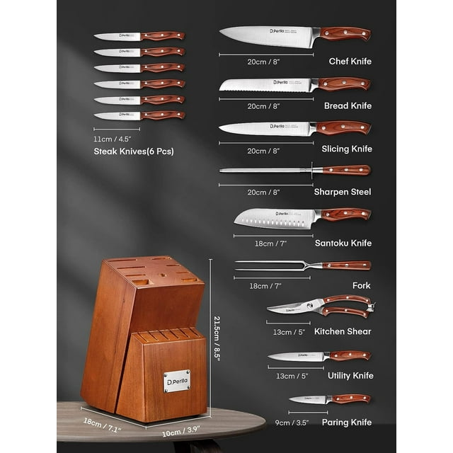 D.Perlla knife set, high carbon stainless steel premium kitchen knife set with wooden block 16pcs, super sharp cutlery knife with carving fork and serrated steak knives. The d.Perlla kitchen knives are characterized by high quality forged blades, which are made of high hardness martensitic stainless steel. The rust resistance is high and the cutting characteristics are perfect.