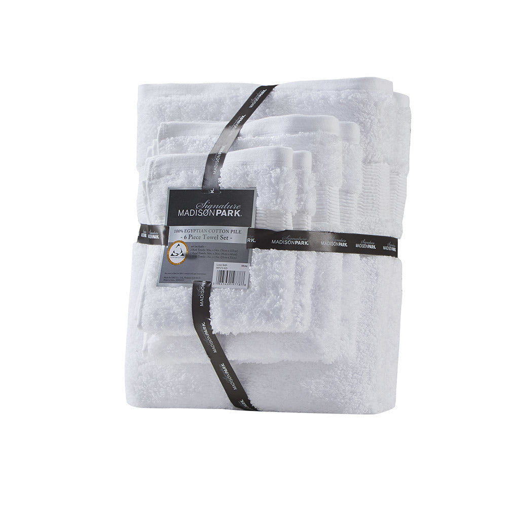Treat yourself with the luxurious comfort of our Madison Park Signature Luxor 100% Egyptian Cotton 6 Piece Towel Set. The long staple cotton yarn creates a rich plush softness, for a glamorous look and silk-like feel. Made from gold seal certified 100% Egyptian cotton, this towel set features 650gsm construction that ensures a premium quality and heavy weight for pure comfort. In addition, these towels are also Made in Green by OEKO-TEX certified, meaning they do not contain any harmful substances or chemicals while also using sustainable processes and socially responsible working conditions, ensuring the best in quality and wellness. With its incredibly soft touch, this 6 piece bath towel set is machine washable for easy care and offers the perfect lavish update to your bathroom decor. Set includes: 2 large 30x54" bath towels, 2 standard 16x26" hand towels, and 2 standard 13x13" wash towels.