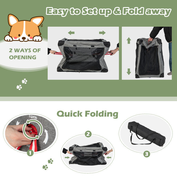 2 Setup Ways and Instant Folding: No tools needed, the soft kennel has 2 red straps on both sides. Just pull them outwards at the same time, the frame will easily expand. Or you can grab a strap and lift the whole crate upwards, it will be instantly set up as well. After use, rotate its side knob, then it will quickly get folded in a small size.
