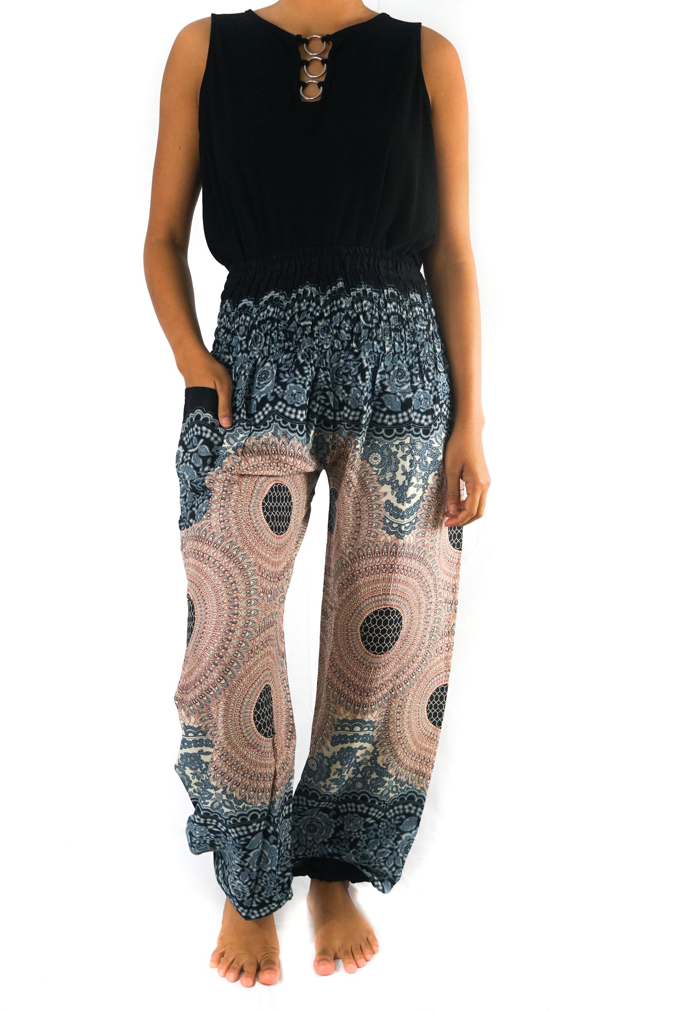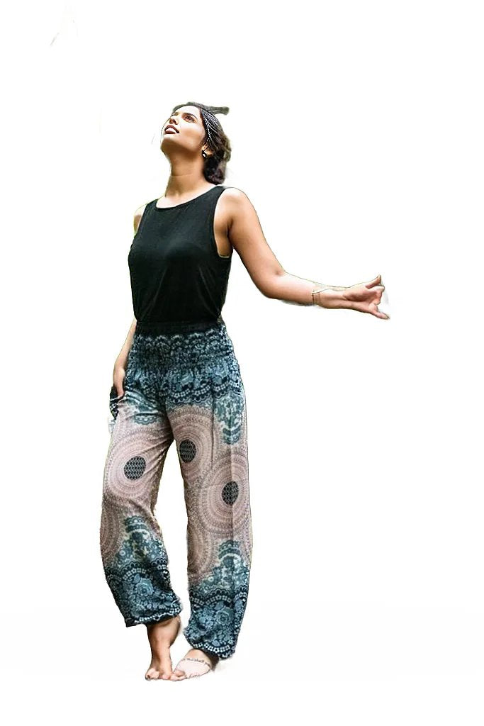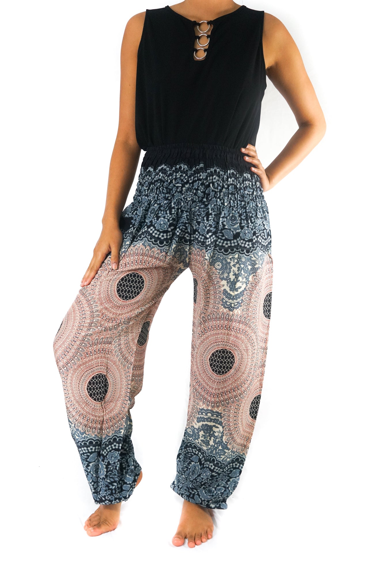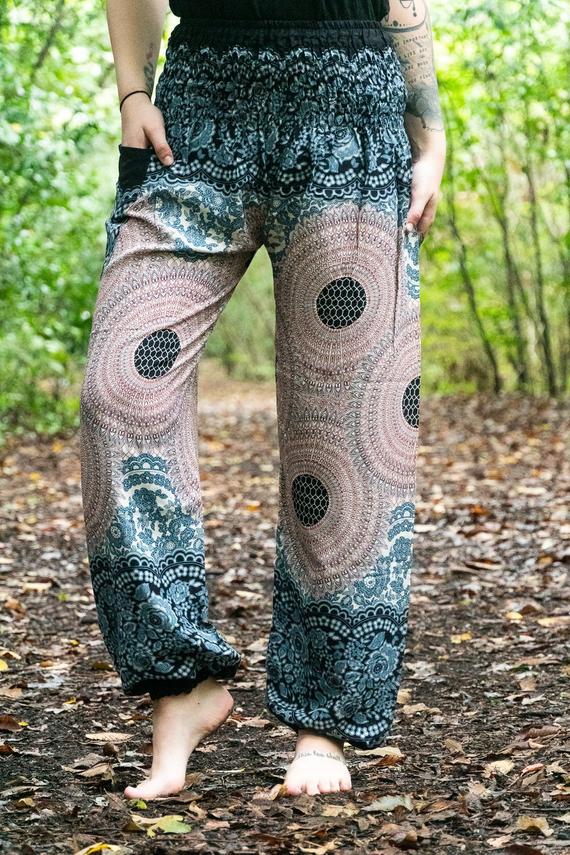 Loose and supremely comfortable Harem Pants. They are unisex and have both an elastic waist and ankles for a flexible fit. Standard one size fits most (US size 0-14Â or XS-L). Our harem pants are handmade with lightweight 100% rayon that is extremely breathable and flowy. These pants are great for exercise, yoga, taking a walk in nature or the beach, festivals, family get together, or just relaxing at your home.