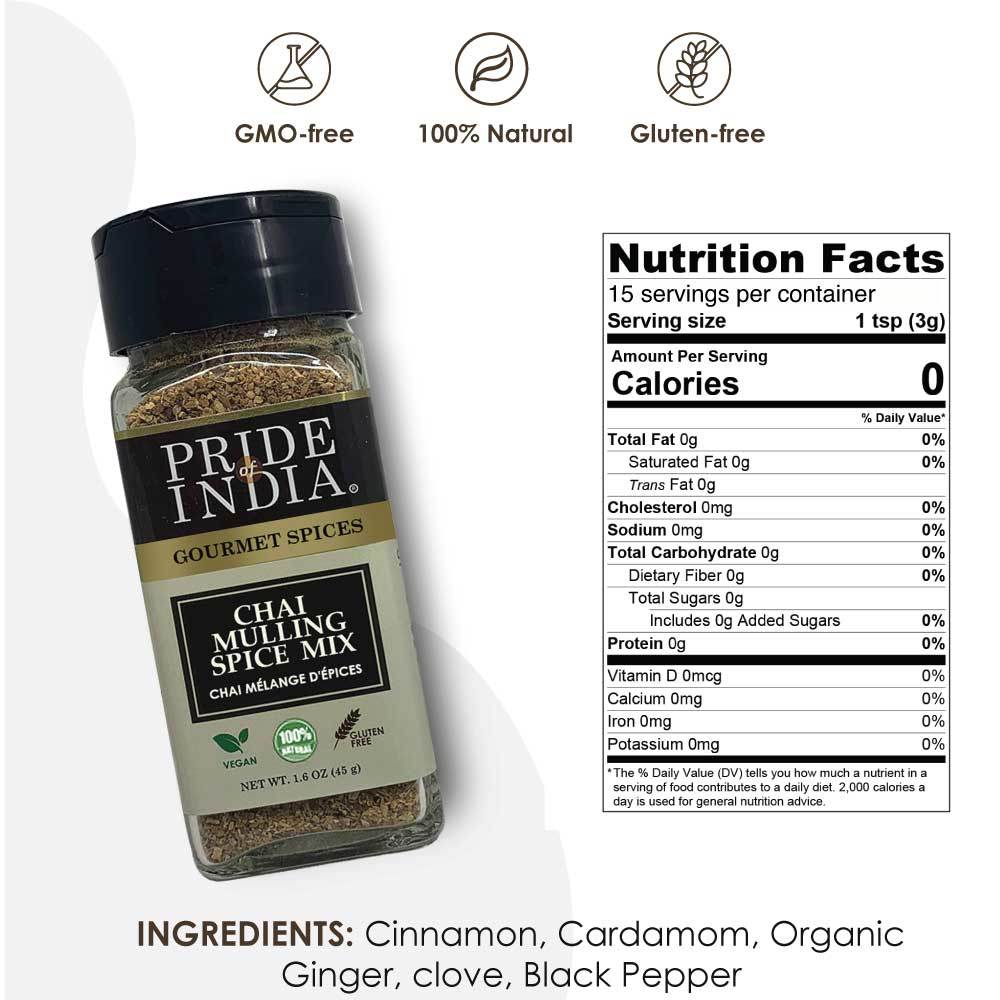 AUTHENTIC 5 SPICE BELND: Enjoy the warm and soothing flavor of traditional warm spices in a bottle with Pride of India Chai Masala Mulling Spice Mix. Made with choicest of spices from sustainably sourced.