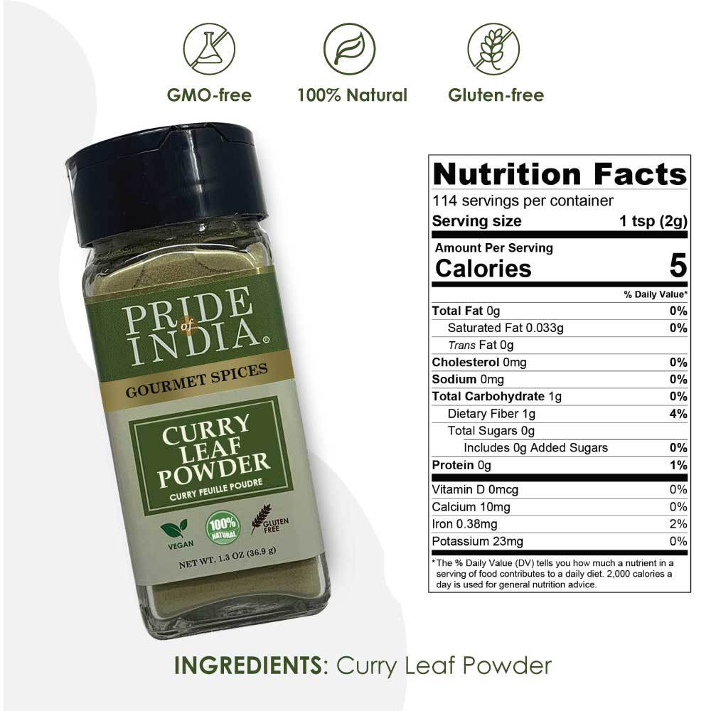 100% CURRY LEAF GROUND: Pride of India curry leaf ground has a fresh aroma and unique yet complex flavor thanks to the sustainably sourced quality leaves that goes through stringent checks before processing and packing in as ground powder.