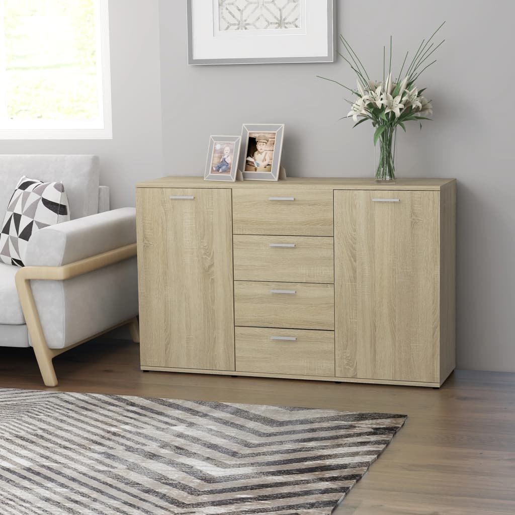 With 2 doors and 4 drawers, the sideboard provides ample storage space for books, multimedia appliances and other items. The sturdy tabletop is ideal for displaying decorative objects, photo frames, or potted plants. Thanks to the premium board material, this sideboard is stable and built to last. Additionally, the drawer cabinet is easy to clean with a damp cloth.