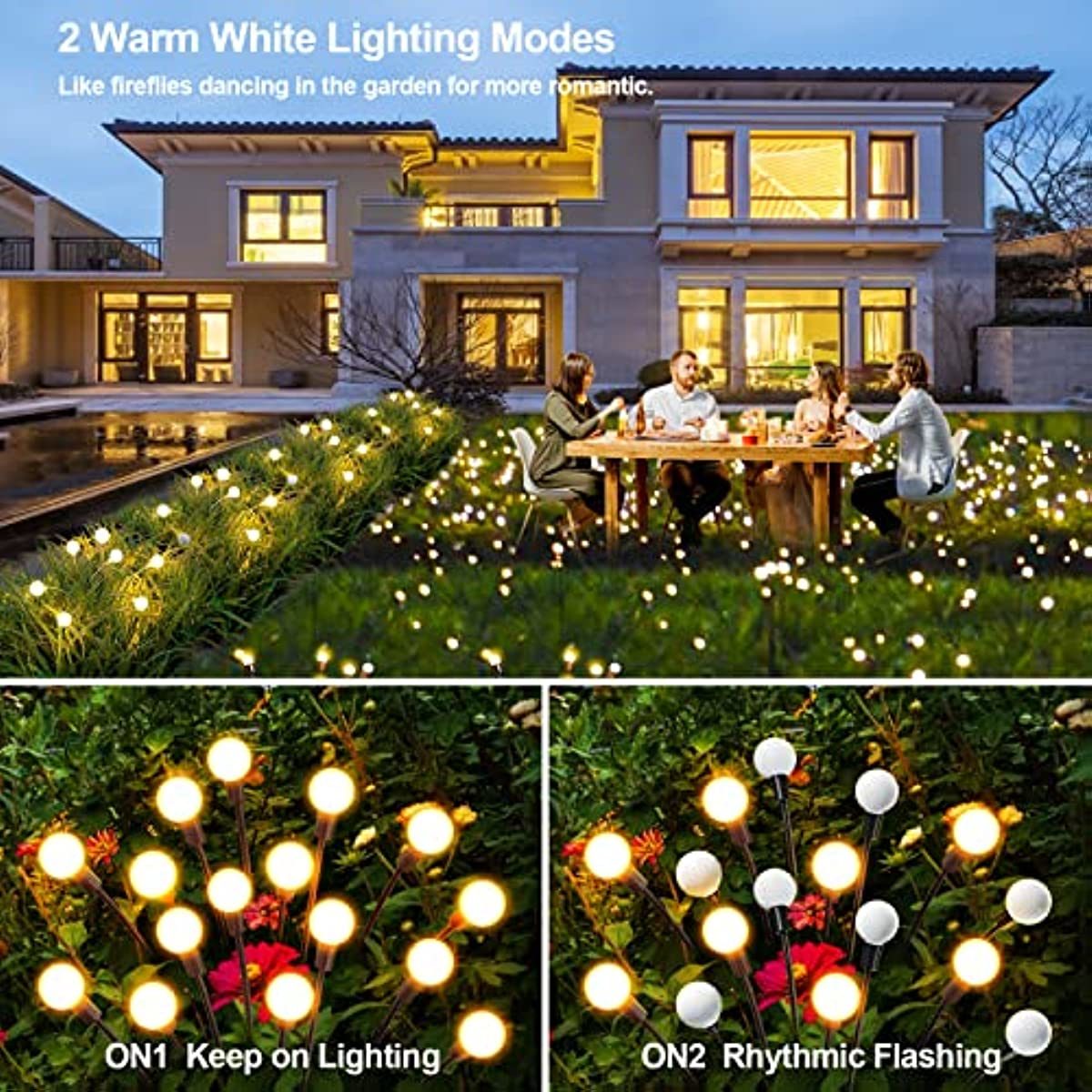 Swaying in the Wind Solar Powered Lights: The solar landscape lights have 8 larger LED bulbs and two lighting modes (warm white light constantly and flashing breathing mode). When night falls; these bright firefly lights sway with the wind and twinkle; creating an exciting and beautiful romantic atmosphere. These solar pathway lights have amazed and praised friends and neighbors.