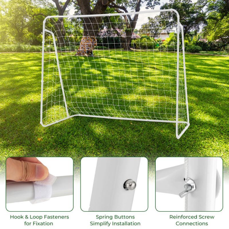 The soccer goal features metal posts to endure intense gameplay.