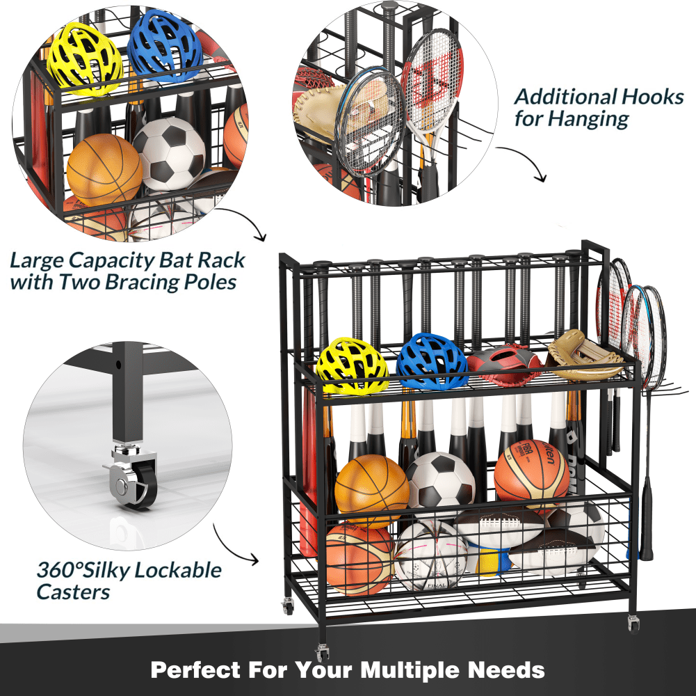 The organizers of the ball have enough space to accommodate both conventional and unconventional sports equipment. Our storage cart measures 31.5 (length) * 16.5 (width) * 35 (height), which is large enough to easily store your soccer, basketball, skateboard, baseball, and more.The garage sports equipment manager function can prevent 24 baseball sports racks, a large storage box, and 2 layers of wire mesh baskets. It also offers 8 J-shaped hooks and baseball bat hooks, allowing you to easily