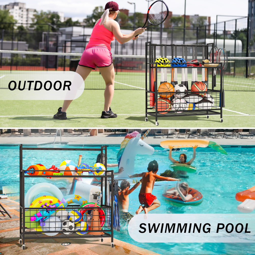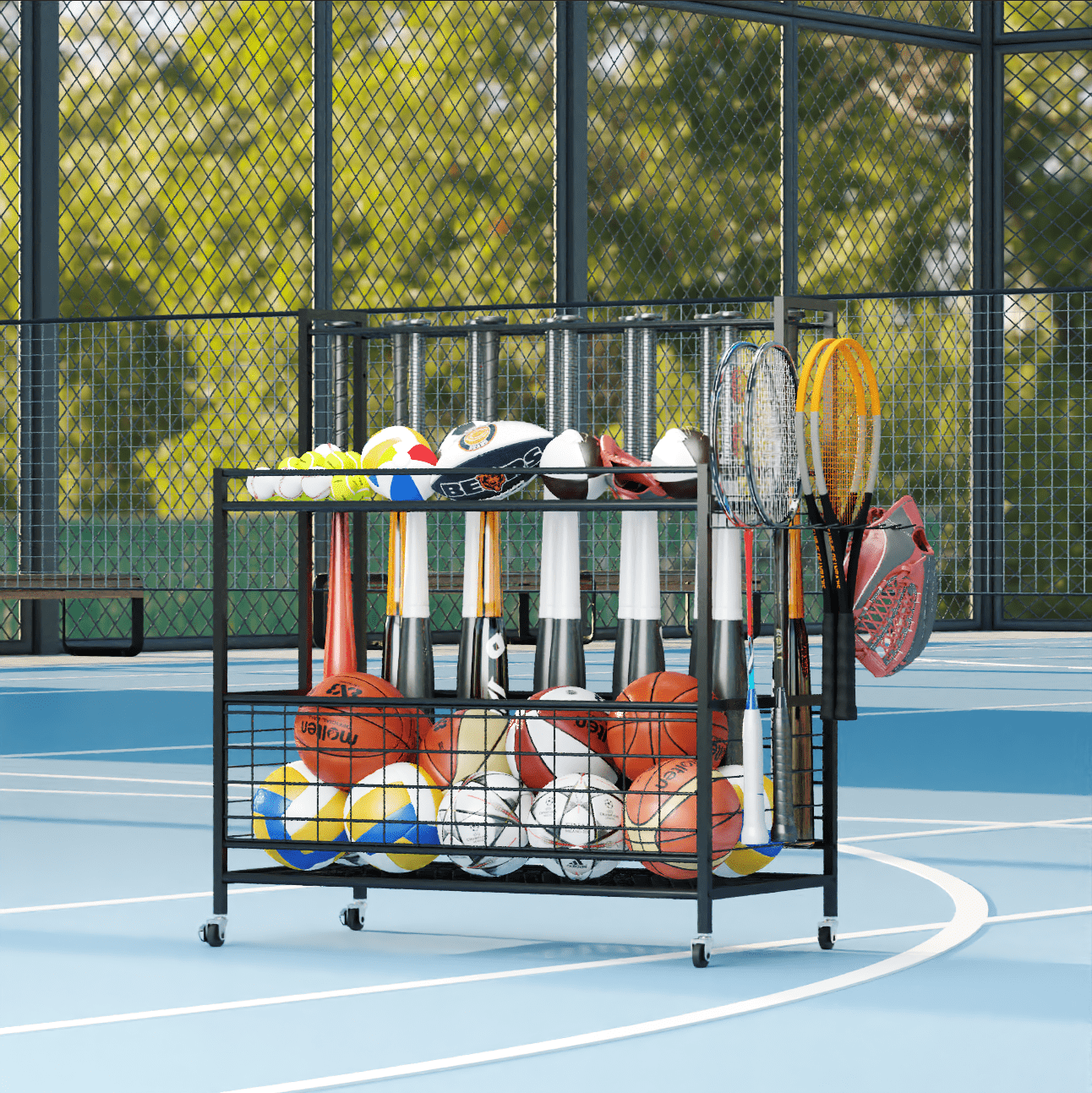 The organizers of the ball have enough space to accommodate both conventional and unconventional sports equipment. Our storage cart measures 31.5 (length) * 16.5 (width) * 35 (height), which is large enough to easily store your soccer, basketball, skateboard, baseball, and more.