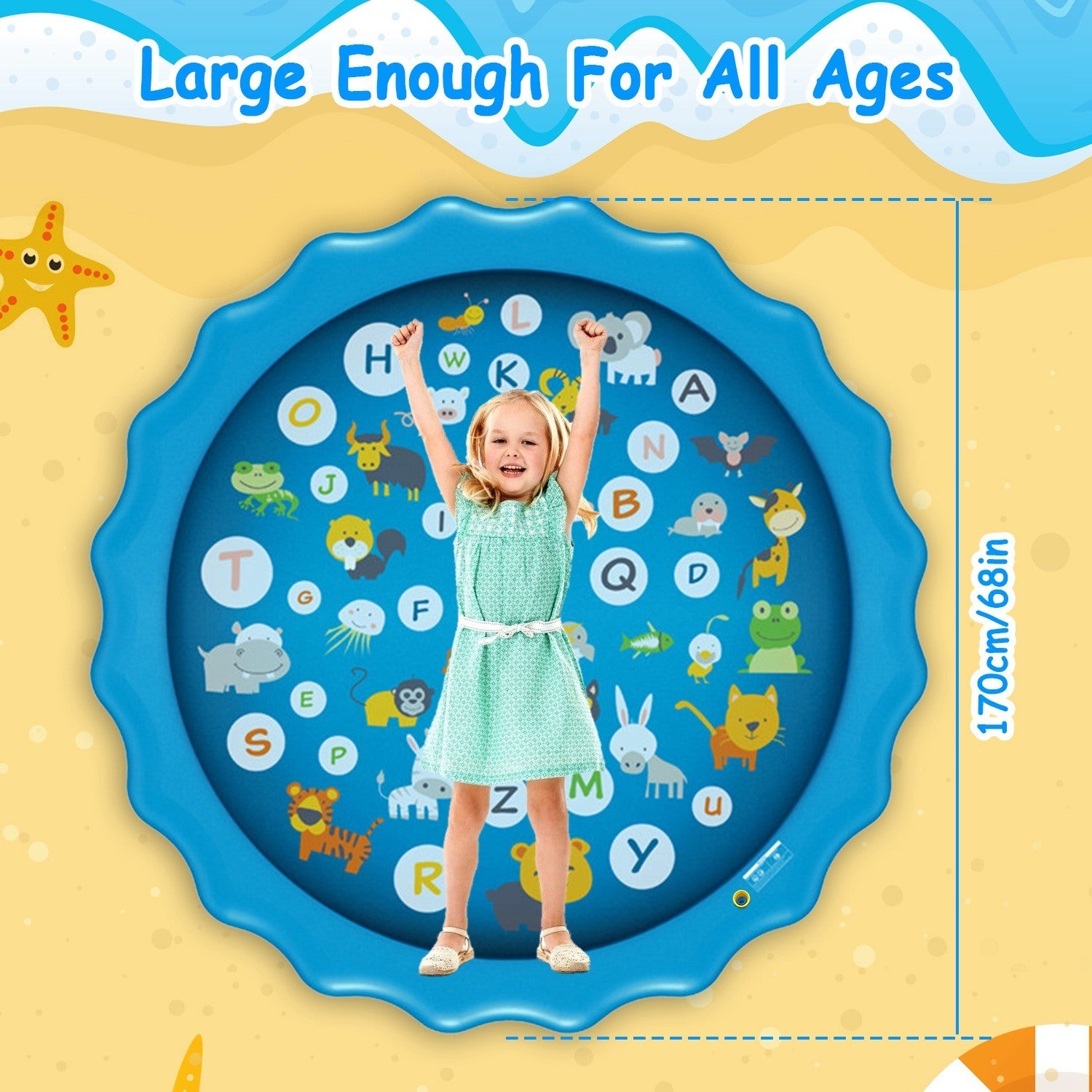 *Best Outdoor Water Toy*:Children pets and dogs will be excited to play in the sprinkle and spray. Perfect for relaxation; party or celebration at lawn; garden; swimming pool or beach. With a learning mat for a base; so your little squirt soaks up some knowledge during play!