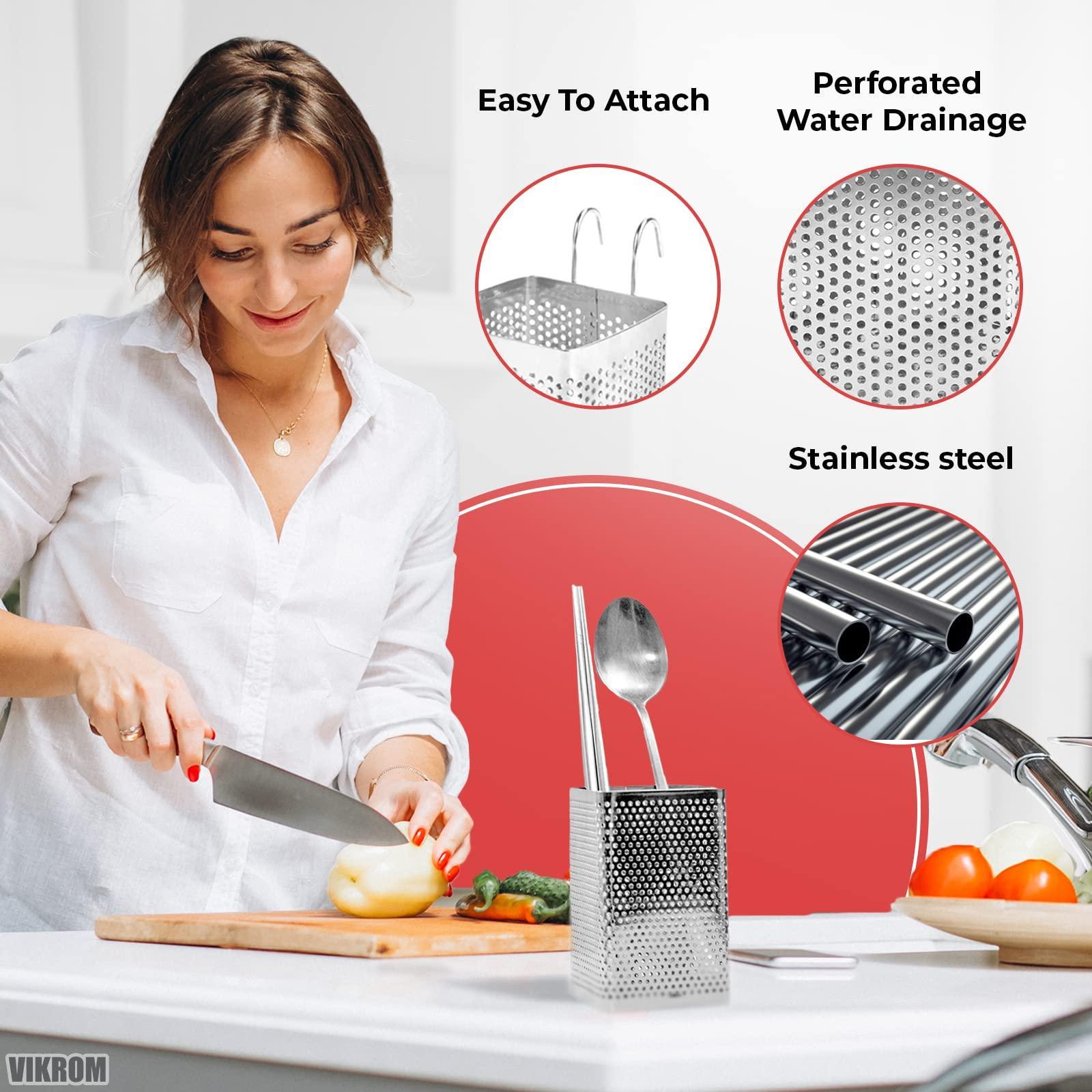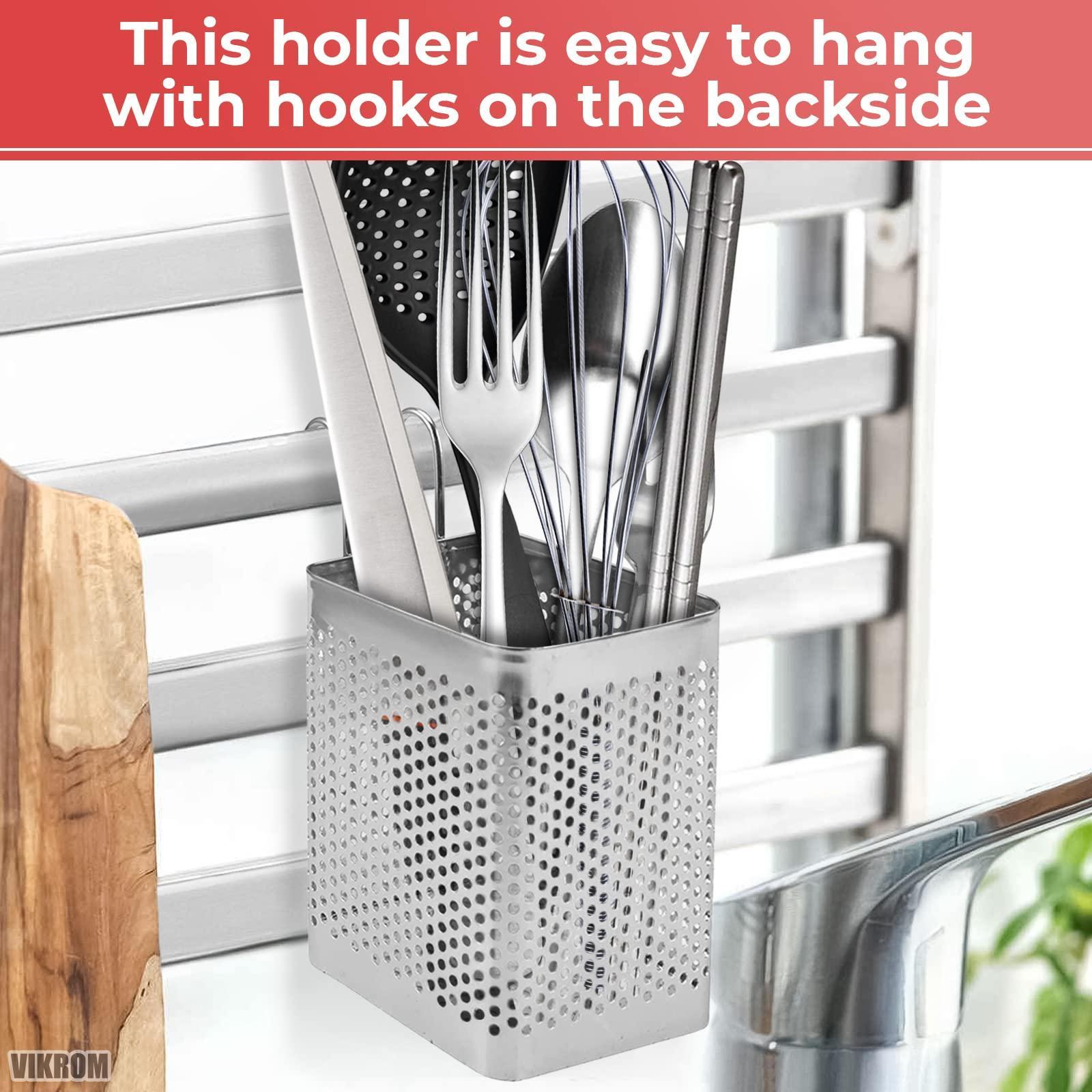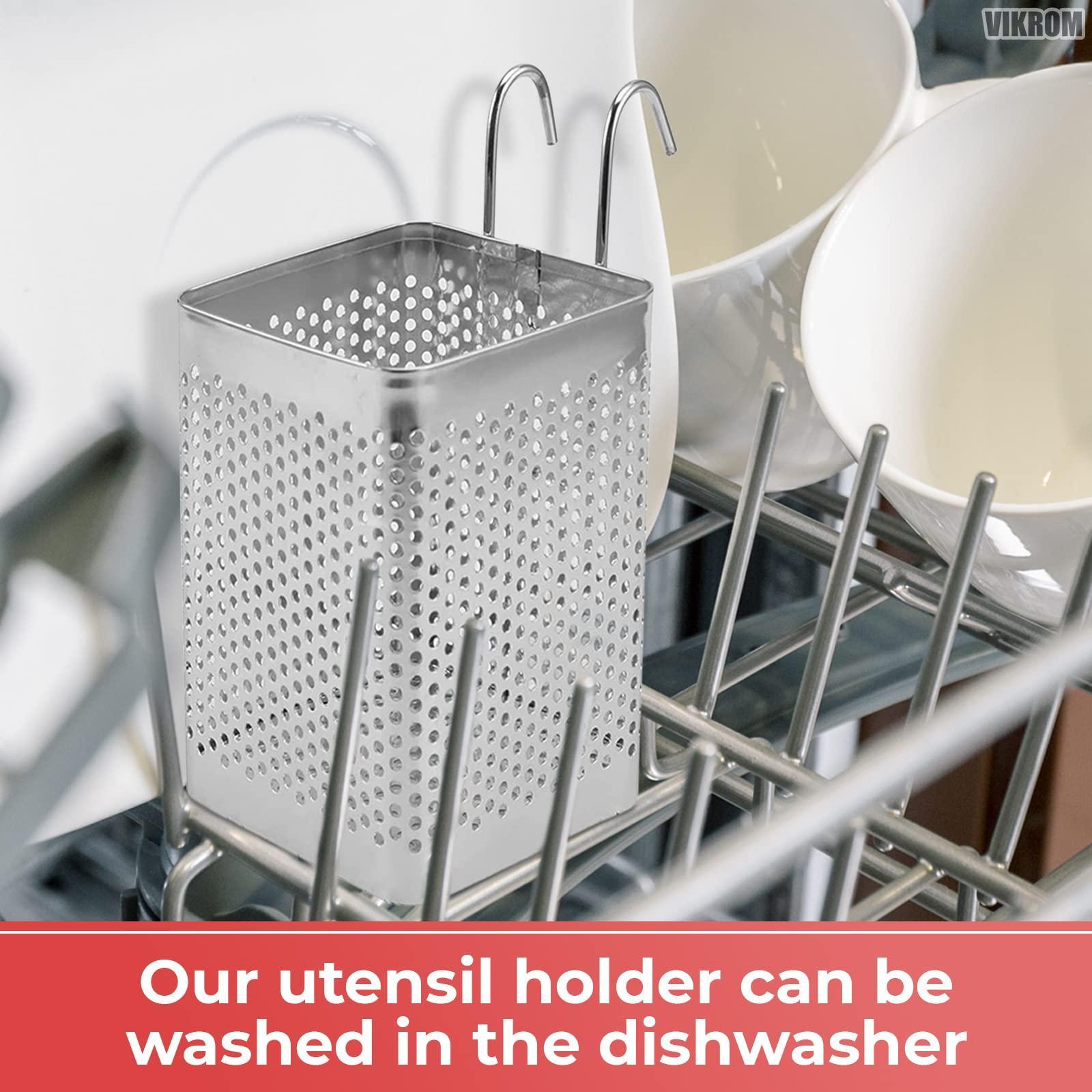 Easy To Attach: This perforated large utensil holder for kitchen counter is a hanging tableware dryer that fastens easy to your dish rack with hooks on the backside. The hooks on the back of this silverware holder for kitchen utensils match most dish racks.