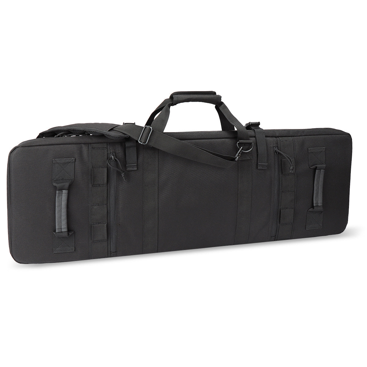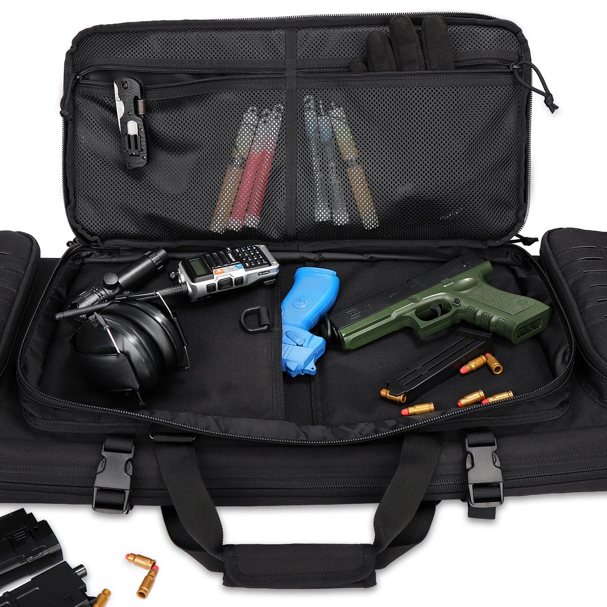 Durable Construction Material: Constructed by heavy-duty 600D nylon fabric exterior & interior. Padded on all side for increased protection. Removable protective pad keep your valuable firearm from wear also can be used as shooting mat.Safe & Spacious: Dual lockable zippers keep your firearms safe; 2 locks included in the package. Holds 2 rifles and 2 pistols; ample storage in the front for your range accessories. Molle compatible webbing for customization.Professional Rifle Bag: Rugged ballistic pack cloth construction; extra 2 outside accessory pouches fit all your need. Portable removable backpack w/storage pouches. Double stitching construction workmanship solid.Hold 2 RifleRefined Design & Functional: Double rifle case with more refined design; multiple compartments inside and out provide storage for just about anything you’ll want to carry. Fully customizable web and loop platform can carry all your other tactical accessories.
