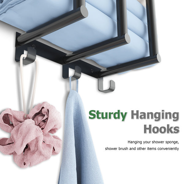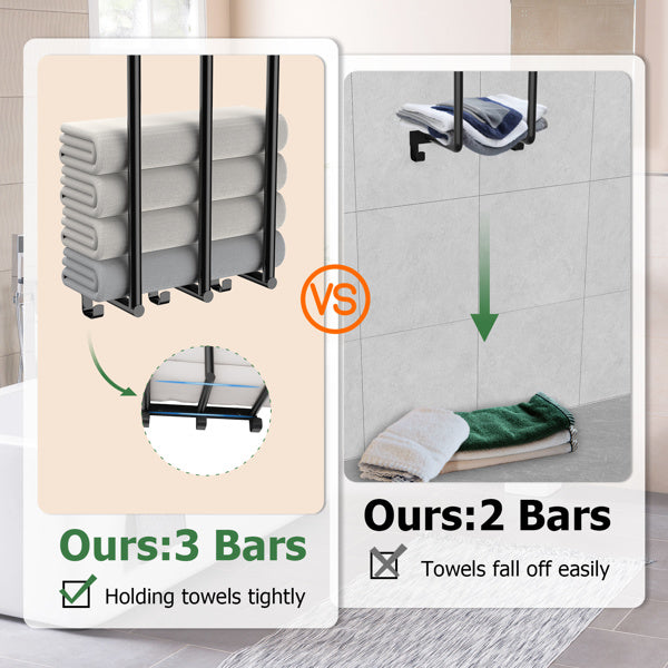 New Upgraded Features - Compared to the 2 bars design of other products, this wall towel rack features a 3 bars design, effectively preventing towels from falling and making this bath towel holder more suitable for storing small towels, more sturdy and reliable. The top of the bathroom towel holder is equipped with a metal shelf, providing additional storage space for items such as shampoo, soap, potted plants, folded towels and combs. Additionally, the 3 hooks at the bottom can be used to hang wet towels, bath sponges, face towels, etc., saving space and keeping the bathroom organized.