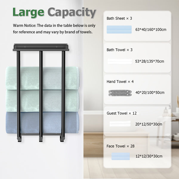 Versatile Design - This wall towel racks for bathroom is the perfect solution for organizing towels in small bathrooms. This wall towel holder features a sleek, vertical storage design that maximizes unused wall space. With its wall-mounted design, this bathroom towel storage rack allows rolled or folded towels to be neatly arranged and easily accessible, providing a tidy and efficient storage solution. Say goodbye to clutter and hello to a smart and stylish towel storage solution!
