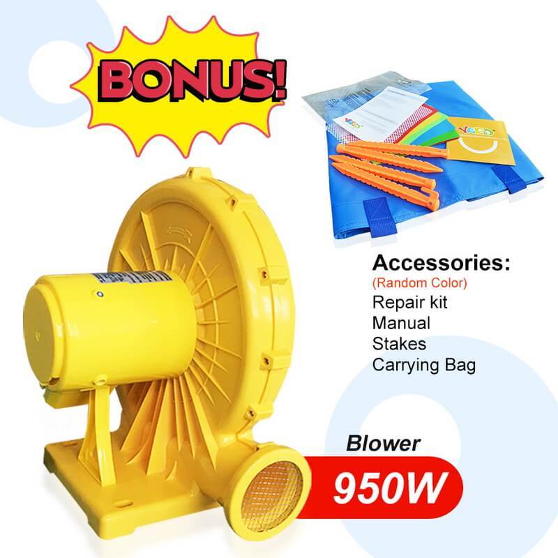 One big 21.3’L x 9.2’W x 7.9’H bounce house Certificated electricity blower with correct plug. One big size strong carrying bag. Enough stakes for bouncer. Free repair kits for backup. Instructions leading to correct using.